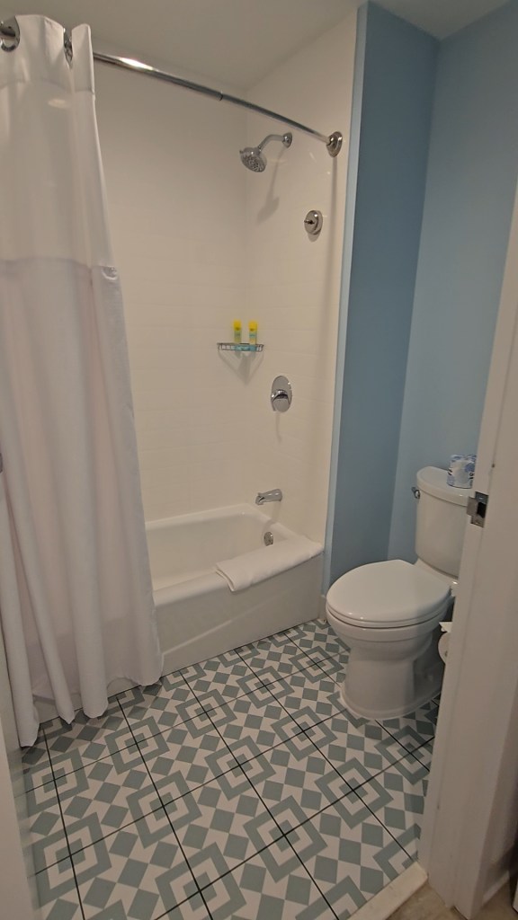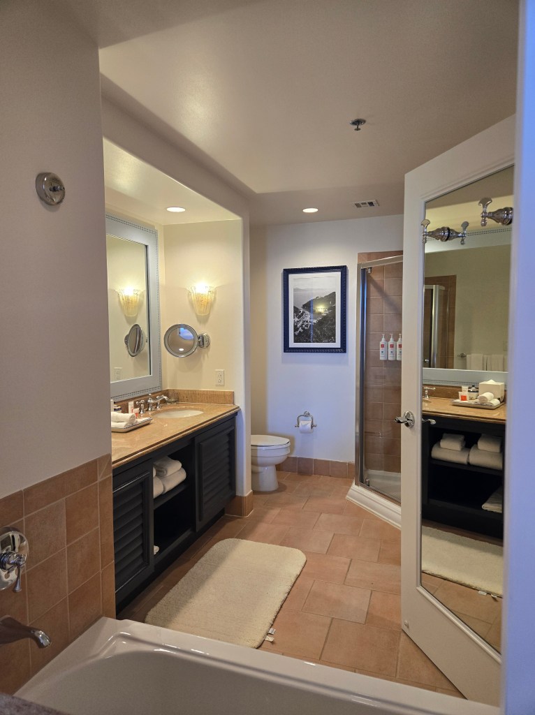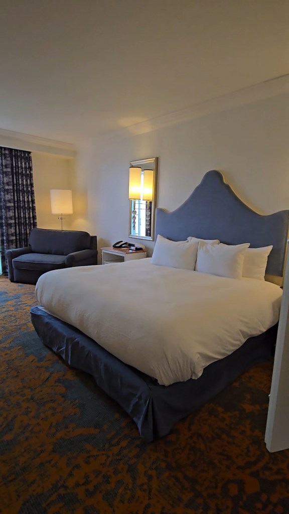 If you’re ready to splurge, Loews Portofino Bay Hotel is a whole different vibe. This Signature resort transports you to a picturesque Italian coastal village. The design is stunning, from the cobblestone courtyard to the elegant rooms. Our room had a soaker tub, a separate shower, and a balcony with a bistro set overlooking the bay—perfect for taking in the ambiance.